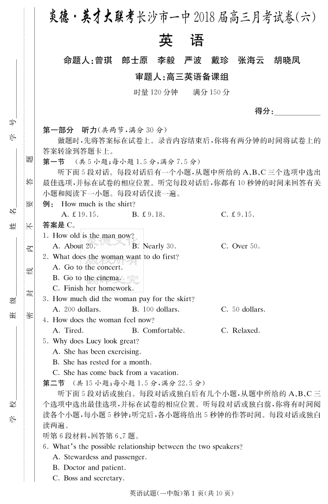 【英語(yǔ)】炎德英才大聯(lián)考2018長(zhǎng)沙一中高三6次月考