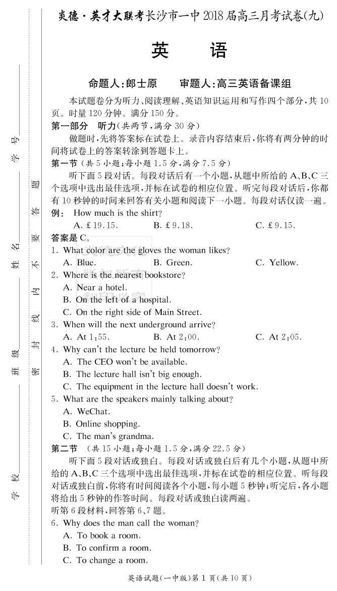 【英語】炎德英才大聯(lián)考2018長沙一中高三9次月考